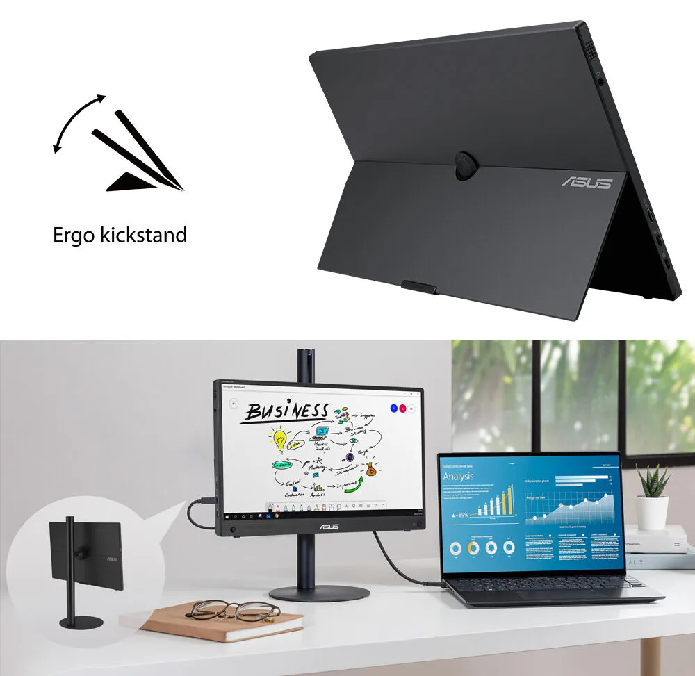 Ergo Kickstand sayesinde monitörünüzü farklı açılarda konumlandırabilir, +15° ile +35° arasındaki eğme ve sağa–sola döndürme fonksiyonlarından yararlanabilirsiniz. 1/4" tripod yuvası, sunumlar ve toplantılar için kişiselleştirilmiş pozisyonlama imkânı sunar. Standlı ölçüleri 359.9 mm genişlik, 226.8 mm yükseklik ve yalnızca 11.9 mm kalınlık olan bu taşınabilir ASUS monitör, ergonomik stant sistemiyle profesyonel kullanıcılara konforlu ve esnek bir deneyim sağlar.
