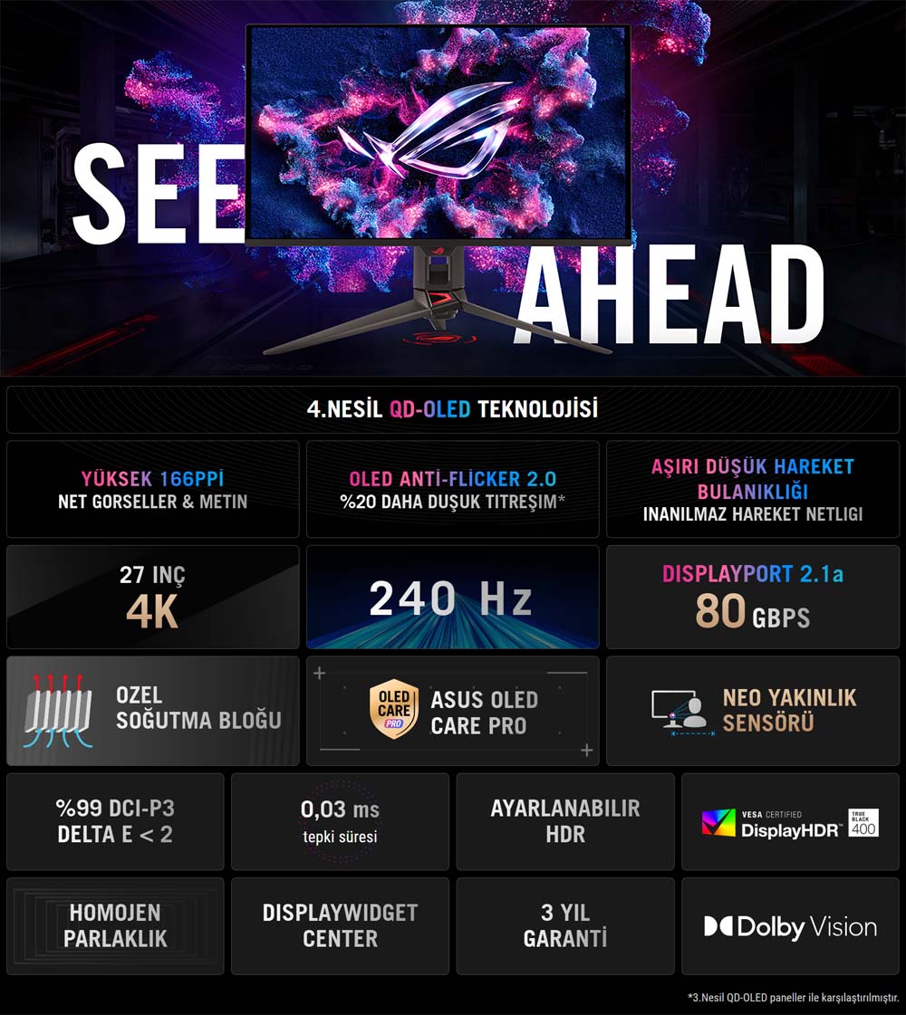 ASUS ROG Swift PG27UCDM monitör, 4. nesil QD-OLED paneliyle üstün görüntü kalitesi sunar. QD-OLED teknolojisi ile daha parlak ve canlı renkler, daha uzun ömür ve yüksek enerji verimliliği elde edilir. 0.03 ms tepki süresi ve 240Hz yenileme hızı ile rekabetçi oyunlarda üst düzey performans sağlar. OLED Care Pro ve homojen parlaklık özellikleri, panelin ömrünü ve görüntü kalitesini artırır.Flicker-Free ve Mavi Işık Filtresi ile Konforlu Kullanım