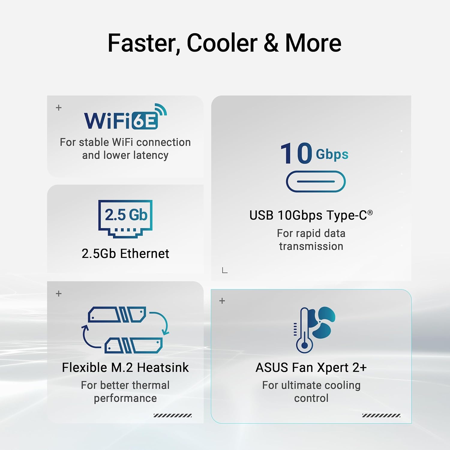 WiFi 6E (802.11ax) desteği ile kesintisiz ve düşük gecikmeli kablosuz bağlantı elde edilir. 2.5Gb Ethernet portu, yüksek hızlı ağ bağlantısı sunar. USB Type-C 10Gbps portu, hızlı veri transferlerini mümkün kılar. Flexible M.2 heatsink ve Asus Fan Xpert 2+ teknolojileri sayesinde, anakart üzerindeki bileşenler her zaman ideal sıcaklıkta çalışır ve sistemin genel performansı artar.
