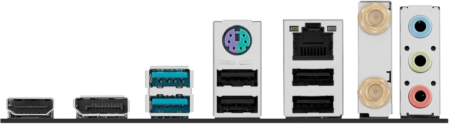 Anakartın arka panelinde DisplayPort 1.4, HDMI 2.1, 6 adet USB Type-A, PS/2 klavye/fare portu, LAN (1 Gbps) ve üçlü ses jakı gibi zengin bağlantı seçenekleri sunulmaktadır. 4K çözünürlüğe kadar desteklenen video çıkışları, çoklu ekran kurulumları için idealdir. Anten bağlantıları, WiFi 6 teknolojisinin kablosuz performansını artırır. Bu bağlantılar sayesinde, her türlü çevre birimi ve ağ cihazı kolayca sisteminize entegre edilebilir.