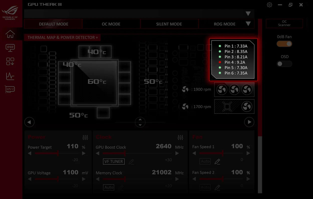 GPU Tweak III, performansın zirvesine ulaşmak için hız aşırtmaya kolayca ince ayar yapma olanağı verir. Üründe, OC modu ve Sessiz mod arasında seçim yapma imkanı, OC tarayıcısı ve hassas ayarlar için Voltaj-Frekans Ayarlayıcısı bulunur.