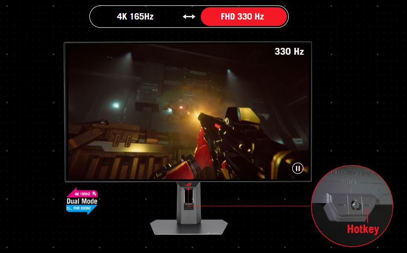 ROG Strix OLED XG32UCWG, çift mod özelliği ile benzersiz bir esneklik sunarak kullanıcıların hızlı aksiyon için yenileme hızına veya sürükleyici görseller için yüksek çözünürlüğe öncelik vermelerini sağlar. Kısayol tuşuna basarak, AAA oyunlar için büyüleyici 4K@165Hz görüntüler ile FPS oyunları için son derece hızlı FHD@330Hz arasında anında geçiş yapabilirsiniz.