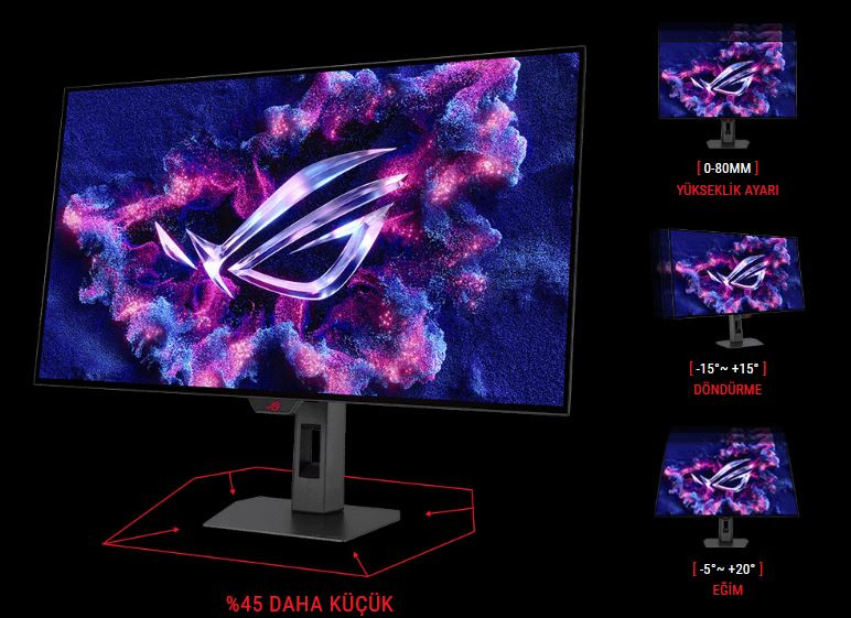 Yeni ROG Strix OLED serisi monitörler, önceki nesil XG monitörlere kıyasla %45 daha küçük kompakt bir stant barındırır ve klavye ve mouse için masa alanından tasarruf sağlar. Stant ideal izleme pozisyonu için yükseklik, döndürme ve eğme ayarları sunar. Ayrıca bu ekran duvar montajı için VESA uyumludur.İlginizi Çekebilecek Diğer Ürünler