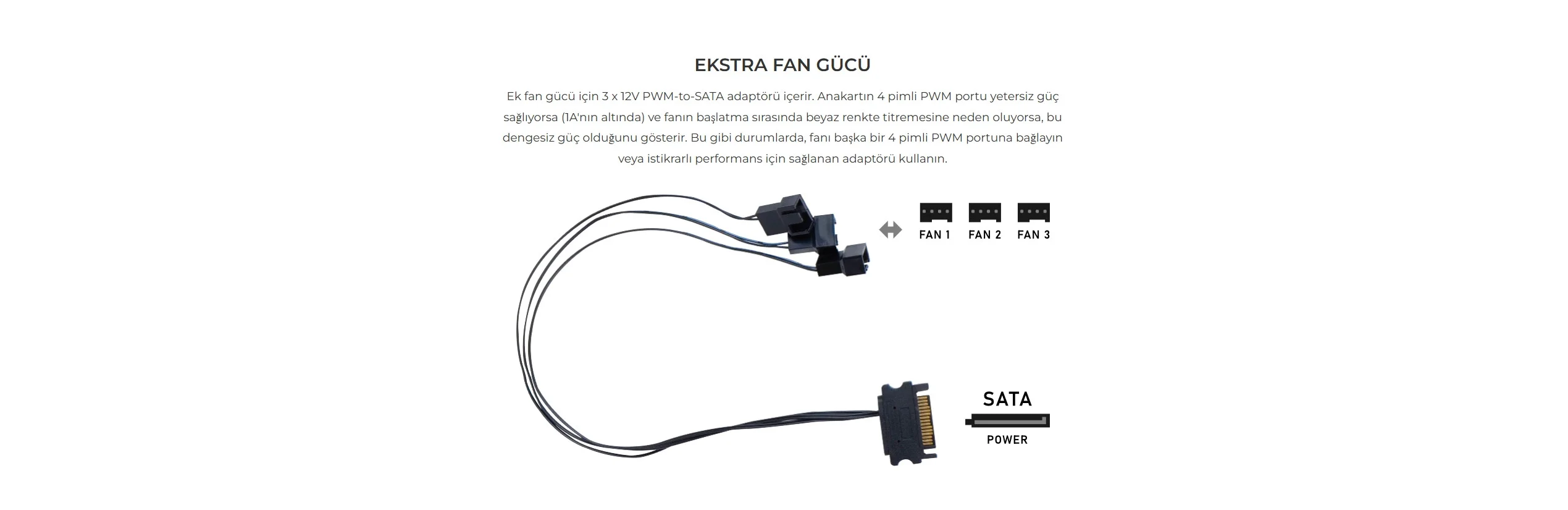 Ek fan gücü için 3 x 12V PWM-to-SATA adaptörü içerir. Anakartın 4 pimli PWM portu yetersiz güç sağlıyorsa (1A'nın altında) ve fanın başlatma sırasında beyaz renkte titremesine neden oluyorsa, bu dengesiz güç olduğunu gösterir. Bu gibi durumlarda, fanı başka bir 4 pimli PWM portuna bağlayın veya istikrarlı performans için sağlanan adaptörü kullanın.TEKNİK ÖZELLİKLER