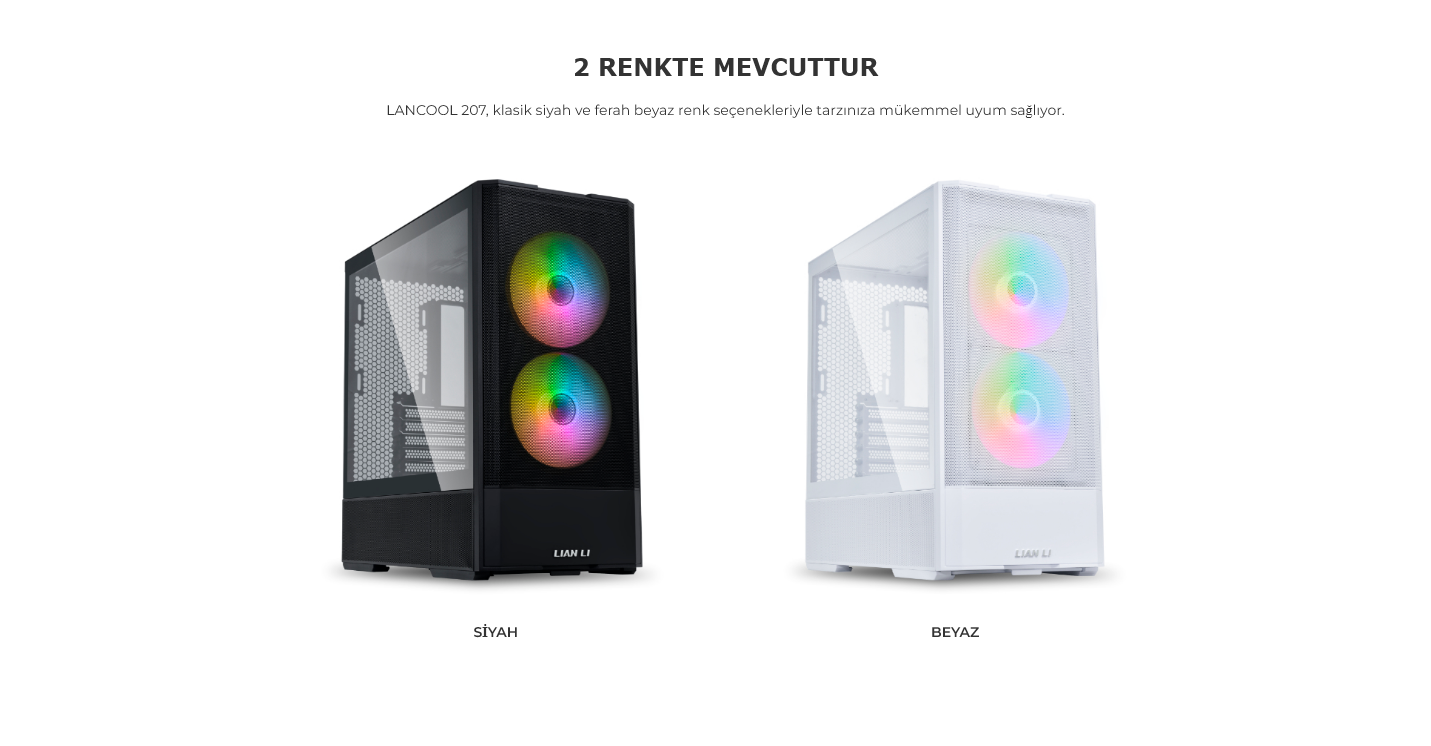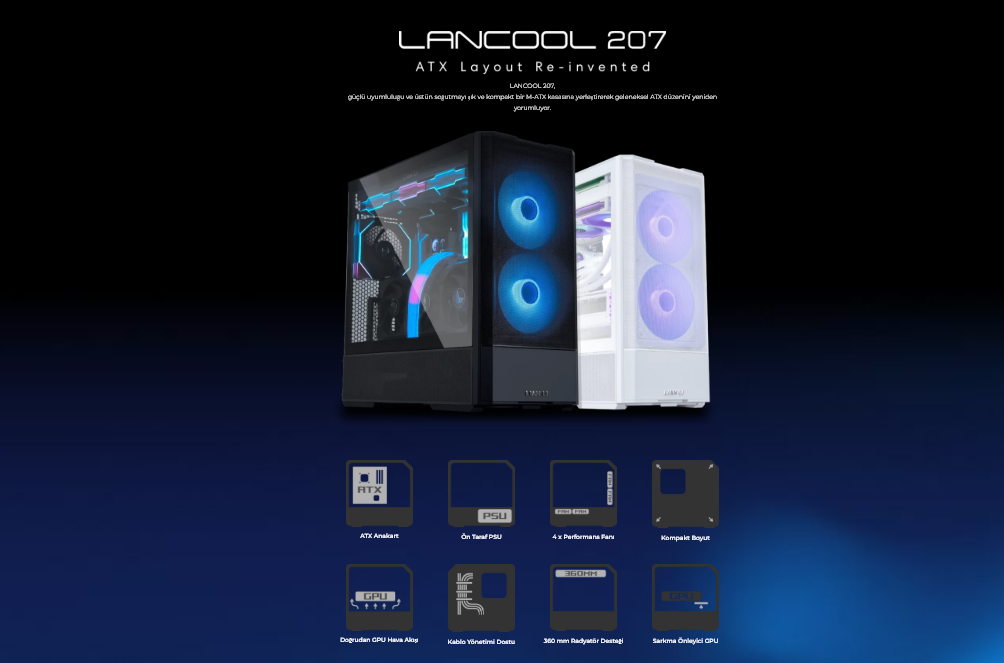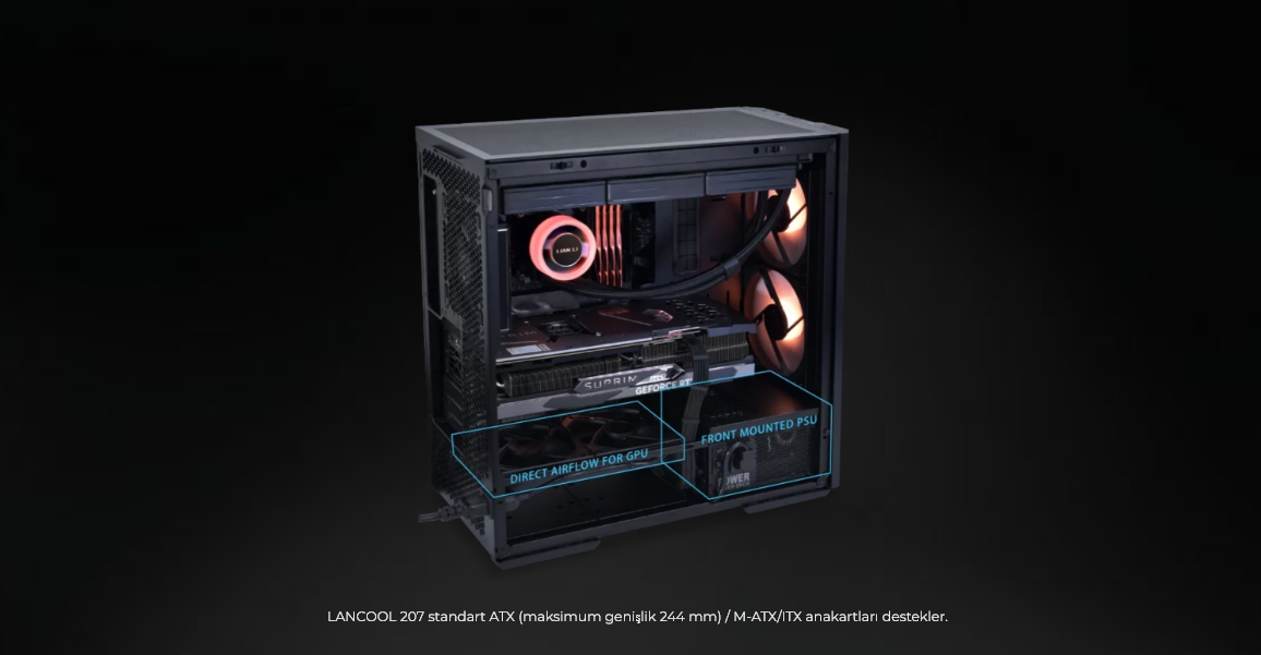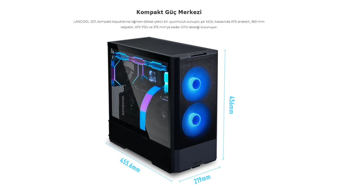LANCOOL 207, kompakt boyutlarına rağmen dikkat çekici bir uyumluluk sunuyor; şık 45,5L kasasında ATX anakart, 360 mm radyatör, ATX PSU ve 375 mm'ye kadar GPU desteği bulunuyor.
