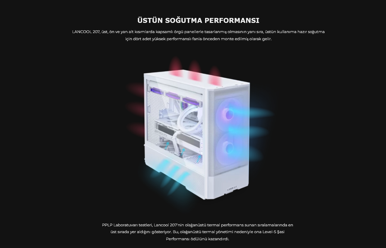 LANCOOL 207, üst, ön ve yan alt kısımlarda kapsamlı örgü panellerle tasarlanmış olmasının yanı sıra, üstün kullanıma hazır soğutma için dört adet yüksek performanslı fanla önceden monte edilmiş olarak gelir.