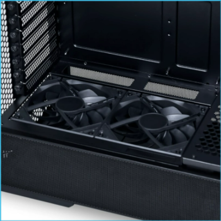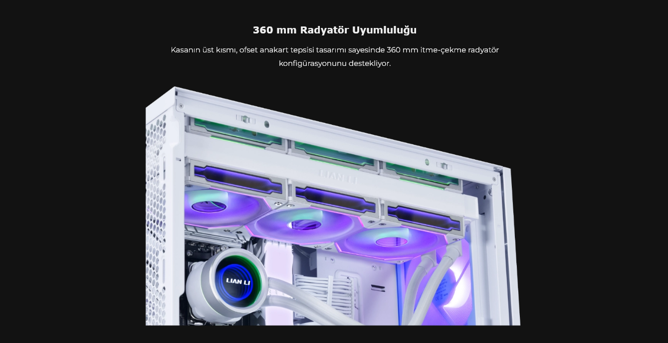 Kasanın üst kısmı, ofset anakart tepsisi tasarımı sayesinde 360 mm itme-çekme radyatör konfigürasyonunu destekliyor.