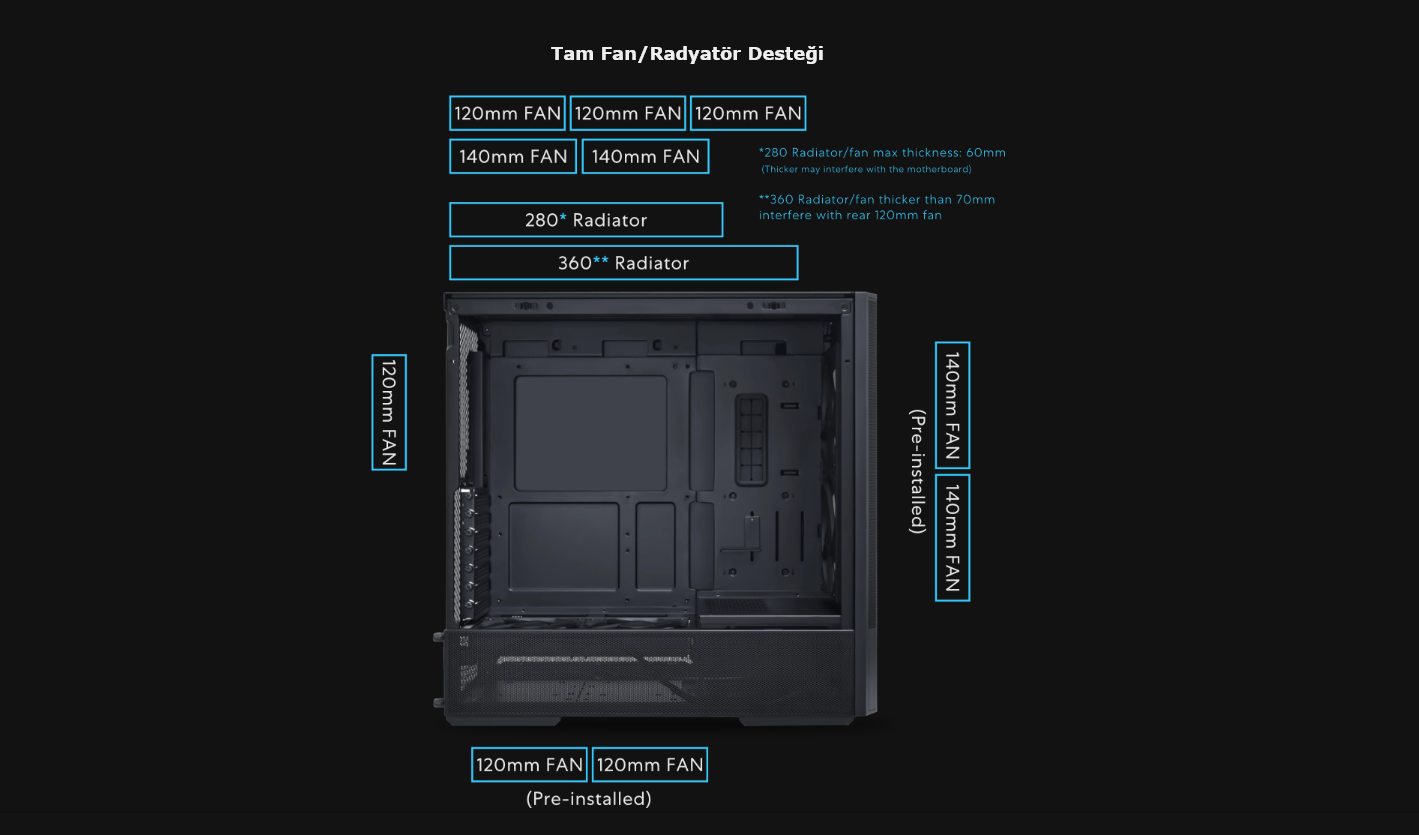 TARAFTAR DESTEĞİ Ön: 140 mm x 2 Üst: 120 mm x 3 veya 140 mm x 2 PSU Örtüsünün Üstü: 120 mm x 2 Arka: 120 mm x 1