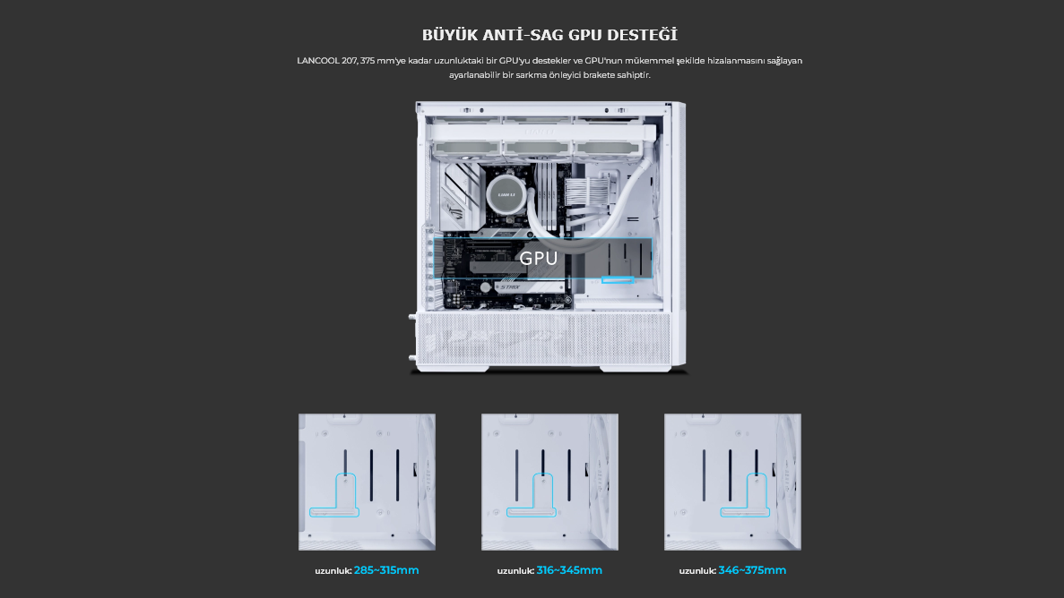 LANCOOL 207, 375 mm'ye kadar uzunluktaki bir GPU'yu destekler ve GPU'nun mükemmel şekilde hizalanmasını sağlayan ayarlanabilir bir sarkma önleyici brakete sahiptir.