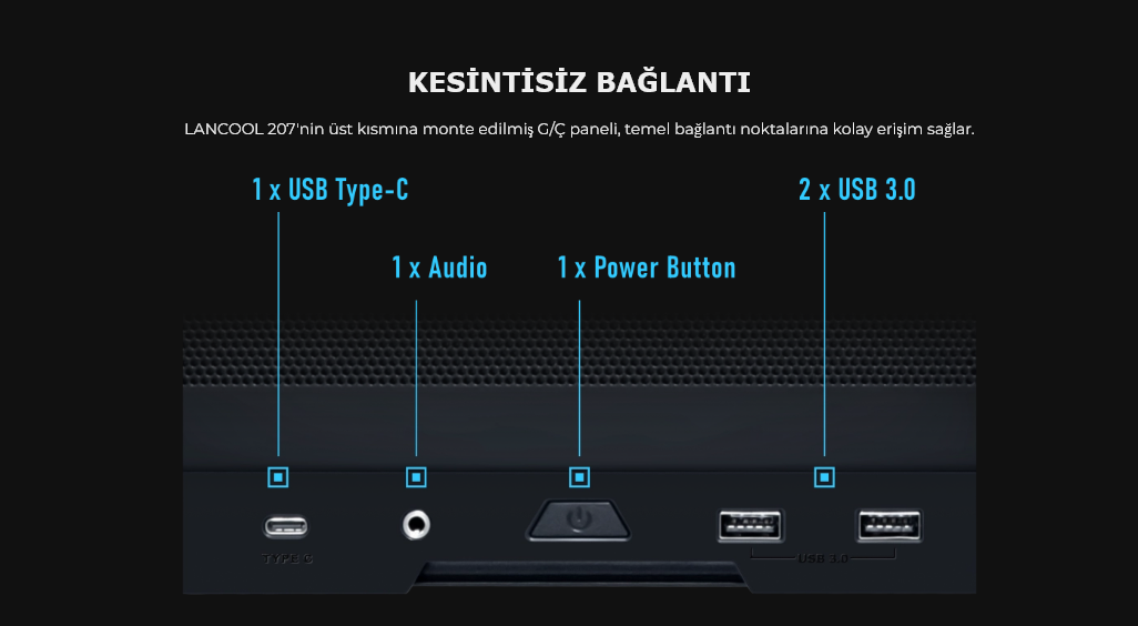LANCOOL 207'nin üst kısmına monte edilmiş G/Ç paneli, temel bağlantı noktalarına kolay erişim sağlar.