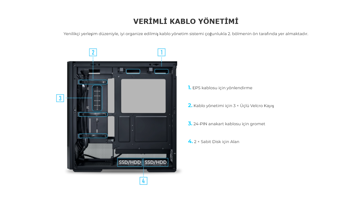 Yenilikçi yerleşim düzeniyle, iyi organize edilmiş kablo yönetim sistemi çoğunlukla 2. bölmenin ön tarafında yer almaktadır.