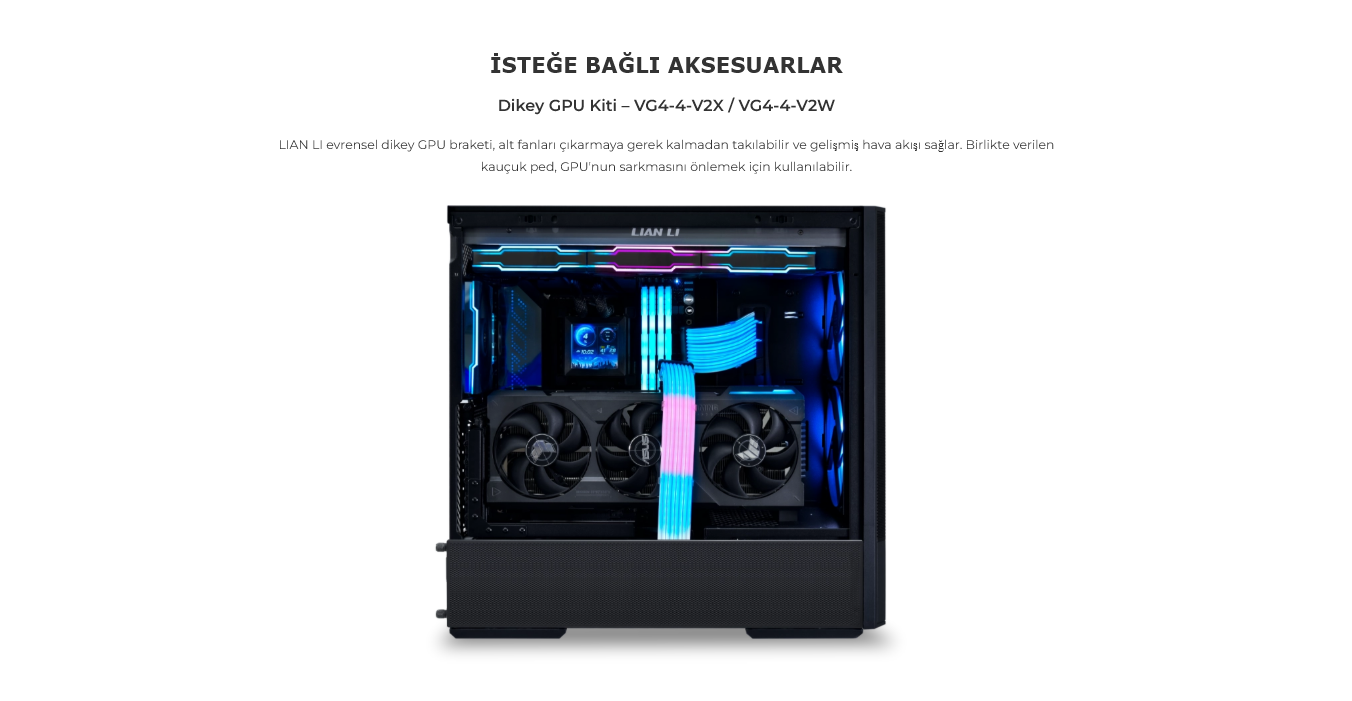 Dikey GPU Kiti – VG4-4-V2X / VG4-4-V2WLIAN LI evrensel dikey GPU braketi, alt fanları çıkarmaya gerek kalmadan takılabilir ve gelişmiş hava akışı sağlar. Birlikte verilen kauçuk ped, GPU'nun sarkmasını önlemek için kullanılabilir.