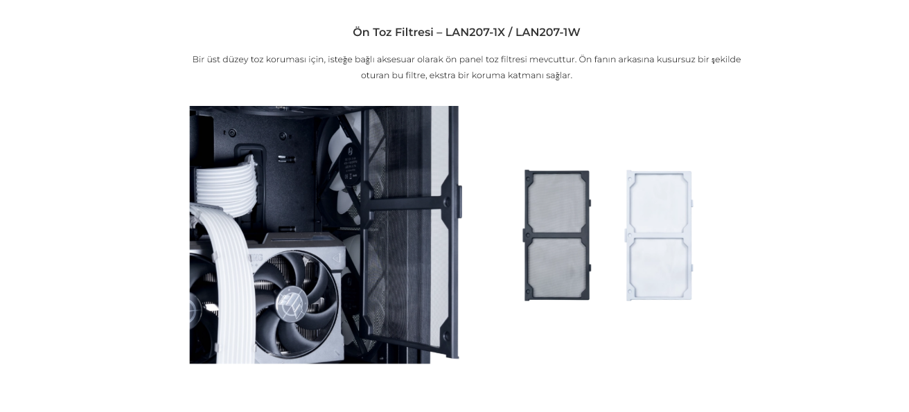 Bir üst düzey toz koruması için, isteğe bağlı aksesuar olarak ön panel toz filtresi mevcuttur. Ön fanın arkasına kusursuz bir şekilde oturan bu filtre, ekstra bir koruma katmanı sağlar.