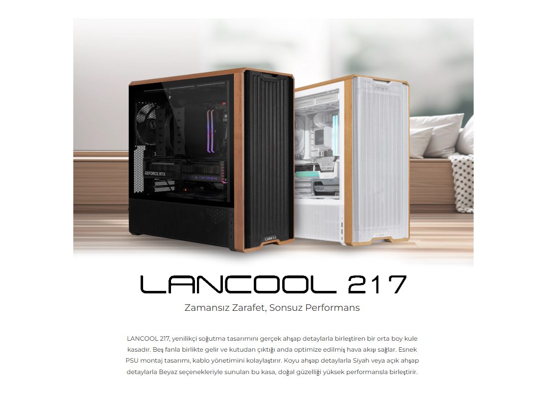 Zamansız Zarafet, Sonsuz PerformansLANCOOL 217, yenilikçi soğutma tasarımını gerçek ahşap detaylarla birleştiren bir orta boy kule kasadır. Beş fanla birlikte gelir ve kutudan çıktığı anda optimize edilmiş hava akışı sağlar. Esnek PSU montaj tasarımı, kablo yönetimini kolaylaştırır. Koyu ahşap detaylarla Siyah veya açık ahşap detaylarla Beyaz seçenekleriyle sunulan bu kasa, doğal güzelliği yüksek performansla birleştirir.