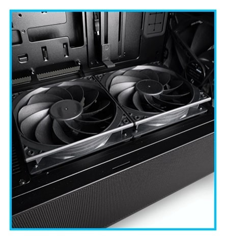 PCIe yuvası braketi, dikey GPU montajını desteklemek için 90 derece döndürülebilir. Bu kurulumda, alt fan, gizli bir görünüm için güç kaynağı kapağının altına taşınabilir ve bu da kullanıcılara sistemlerini kurarken daha fazla esneklik sağlar.