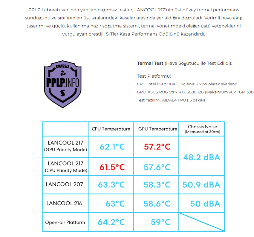 PPLP Laboratuvarı'nda yapılan bağımsız testler, LANCOOL 217'nin üst düzey termal performans sunduğunu ve sınıfının en üst sıralarındaki kasalar arasında yer aldığını doğruladı. Verimli hava akışı tasarımı ve güçlü, kullanıma hazır soğutma sistemi, termal yönetimdeki olağanüstü yeteneklerini vurgulayan prestijli S-Tier Kasa Performans Ödülü'nü kazandırdı.
