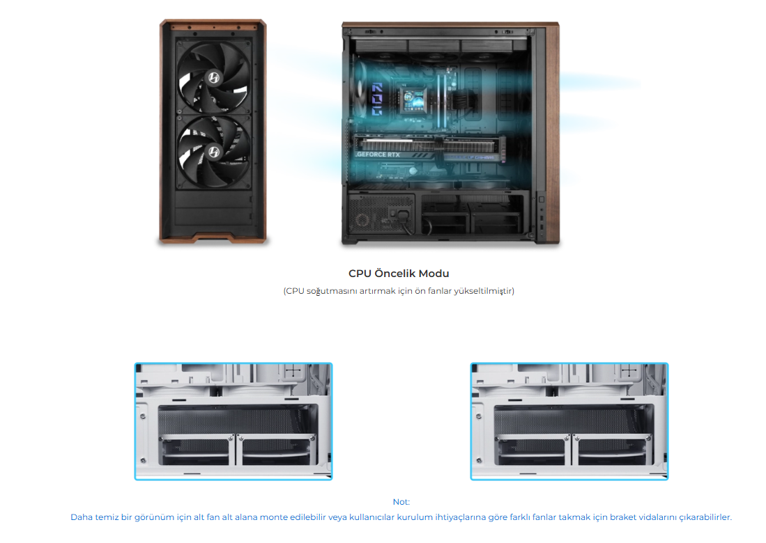 Daha temiz bir görünüm için alt fan alt alana monte edilebilir veya kullanıcılar kurulum ihtiyaçlarına göre farklı fanlar takmak için braket vidalarını çıkarabilirler.