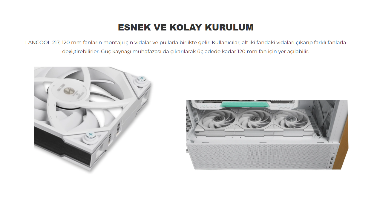 LANCOOL 217, 120 mm fanların montajı için vidalar ve pullarla birlikte gelir. Kullanıcılar, alt iki fandaki vidaları çıkarıp farklı fanlarla değiştirebilirler. Güç kaynağı muhafazası da çıkarılarak üç adede kadar 120 mm fan için yer açılabilir.ÇİFT PSU MONTAJI, ESNEK YAPILAR