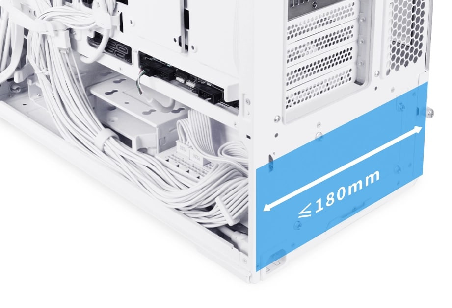 PSU, konektörler sağ tarafa bakacak şekilde 90° döndürüldüğünde, 180 mm'ye kadar kompakt PSU'ları destekler. Bu, kablo yönlendirme alanını optimize eder ve fanın PSU'yu doğrudan soğutmasını sağlayarak soğutma verimliliğini artırır. Kullanıcılar ayrıca, gizli bir görünüm için birlikte verilen iki alt fanı braketin altına taşıyarak kasayı daha temiz ve düzenli hale getirebilirler.