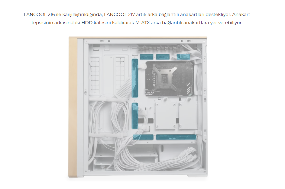 LANCOOL 216 ile karşılaştırıldığında, LANCOOL 217 artık arka bağlantılı anakartları destekliyor. Anakart tepsisinin arkasındaki HDD kafesini kaldırarak M-ATX arka bağlantılı anakartlara yer verebiliyor.