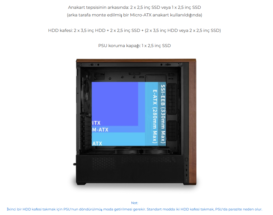 PSU DESTEK UZUNLUĞU Standart Mod:ATX(220 mm'nin altında) Döndürülmüş Mod:ATX(180 mm'nin altında)