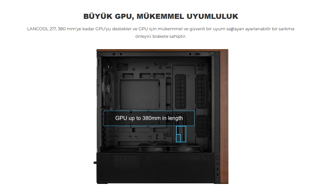 LANCOOL 217, 380 mm'ye kadar GPU'yu destekler ve GPU için mükemmel ve güvenli bir uyum sağlayan ayarlanabilir bir sarkma önleyici brakete sahiptir.