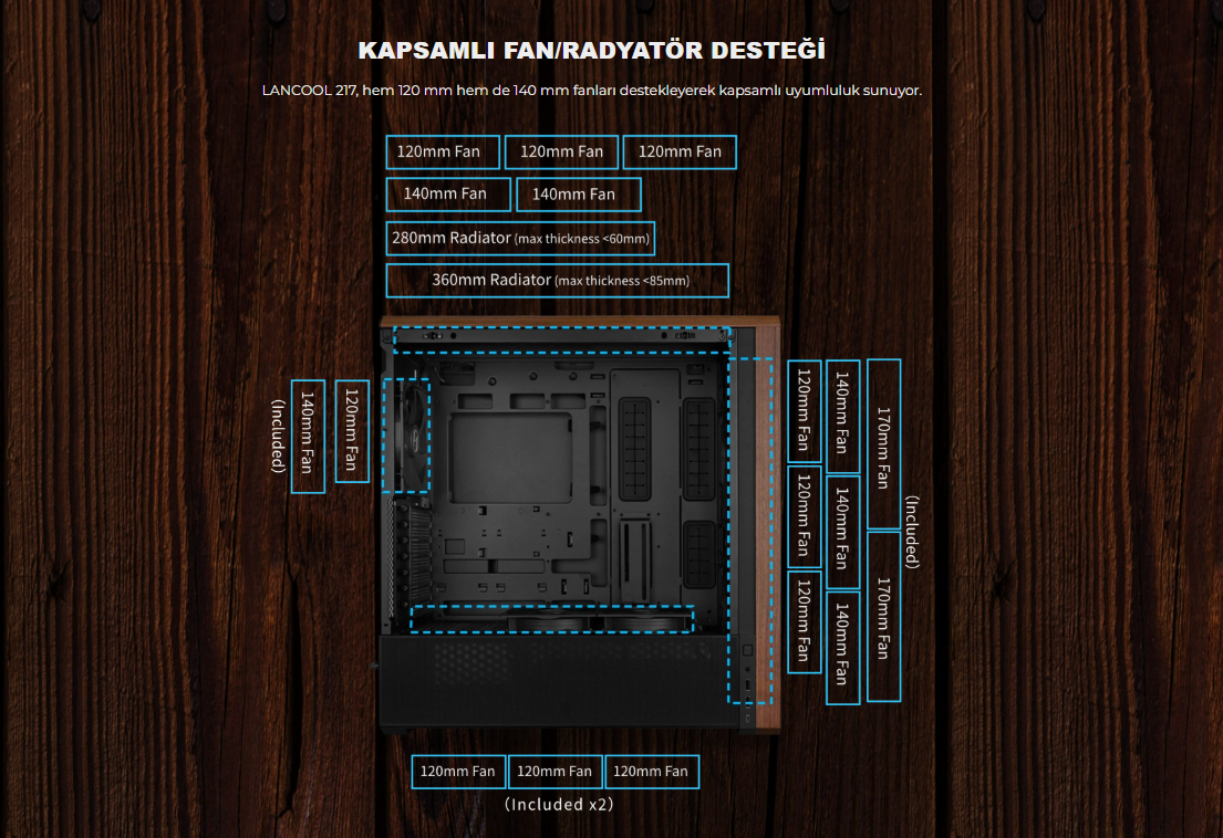 LANCOOL 217, hem 120 mm hem de 140 mm fanları destekleyerek kapsamlı uyumluluk sunuyor.