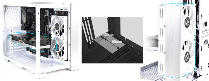 Lian Li O11 Dynamic Mini gaming kasanın yan fan/radyatör braketi arkasındaki 30mm’lik boşluk, fanları monte etmenize ve bu sayede radyatörü doğrudan soğutmak için verimli bir şekilde temiz hava akışı sağlamanıza imkan tanırken, bu kompakt kasada uzun boyutlu ekran kartı kurulumu yapabilmeniz için size yeterli alan bırakır.