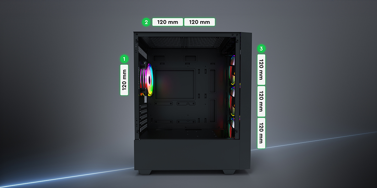 Kompakt boyutlarıyla masaüstünüzde daha az yer kaplamasını sağlıyor. Aynı zamanda, geniş fan ve radyatör desteği ile yüksek performanslı oyunlar sırasında bile bilgisayarınızın serin kalmasına olanak sağlar.