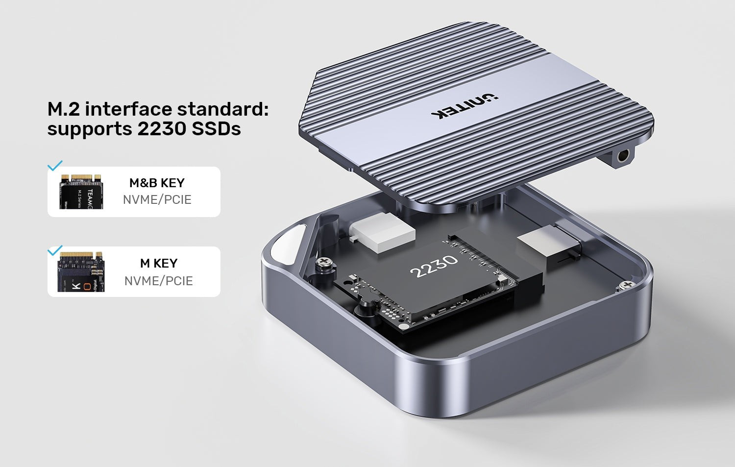 M.2 arayüz standardına sahip olup 2230 SSD’leri destekler. M&B Key ve M Key NVMe/PCIe seçenekleriyle geniş uyumluluk sunar. Şık ve dayanıklı tasarımıyla güvenilir performans sağlar.
