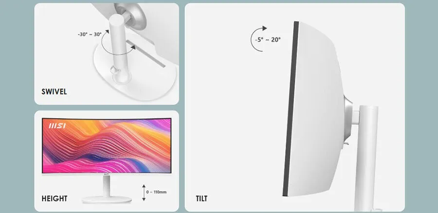 MSI Modern MD342CQPW Gaming Monitör, esnek ergonomik stant yapısı sayesinde her kullanıcıya uygun bir pozisyon sunar. 110 mm’ye kadar yükseklik ayarı, -5° ila +20° arası eğim ve -30° ile +30° arası sağa-sola döndürme özelliği, çalışma veya oyun ortamlarında maksimum rahatlık sağlar. Ergonomik ayarlanabilirlik, uzun süreli kullanımlarda vücut sağlığını destekler ve kişisel konforu artırır. Modern ofisler ve ev ortamları için uyumlu, işlevsel bir monitör deneyimi sunar.
