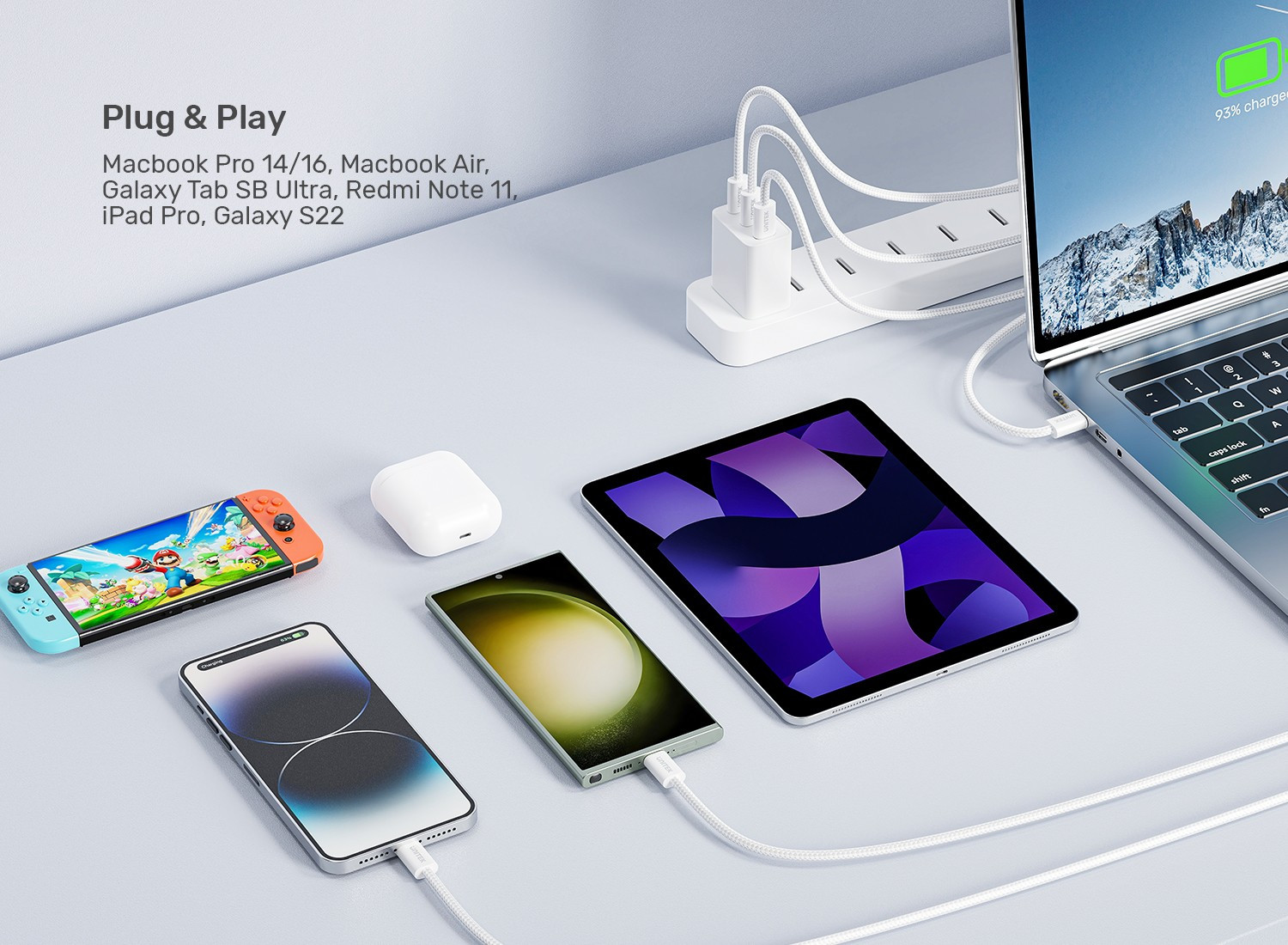 MacBook Pro 14/16, MacBook Air, Galaxy Tab S8 Ultra, Redmi Note 11, iPad Pro ve Galaxy S22 gibi geniş cihaz yelpazesiyle uyumludur. Tak ve çalıştır özelliği ile hızlı bağlantı ve hızlı şarj imkanı sunar, favori cihazlarınızla sorunsuz çalışır.