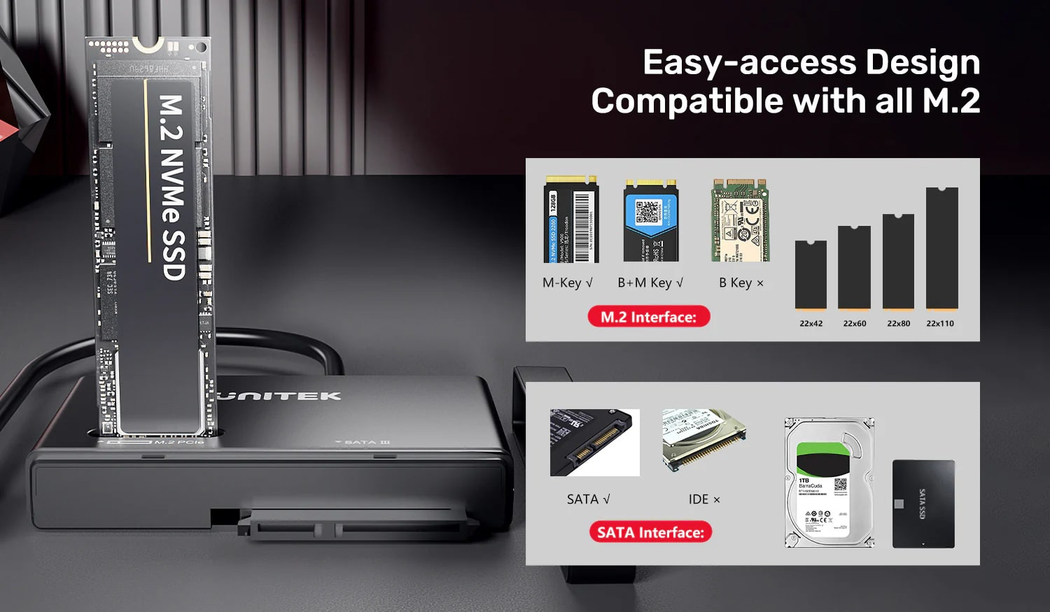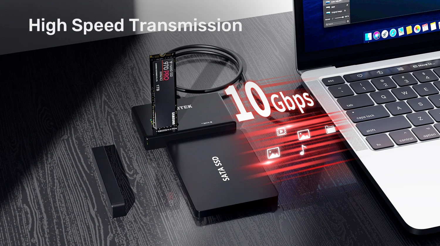 M.2 PCIe NVMe SSD'ler ve 2,5 inç/3,5 inç SATA SSD/HDD'ler, yeni kurulumlar, yükseltmeler, yedeklemeler, oyun ve film akışı için idealdir. 10 Gbps USB-C aktarım hızları, UASP hızlandırma ve sıcak değiştirme özelliğiyle verimli veri işleme sağlar. JMS581DC çipi, güvenilir performans için kırılma ve aşırı akım korumasıyla güvenlik sağlar.
