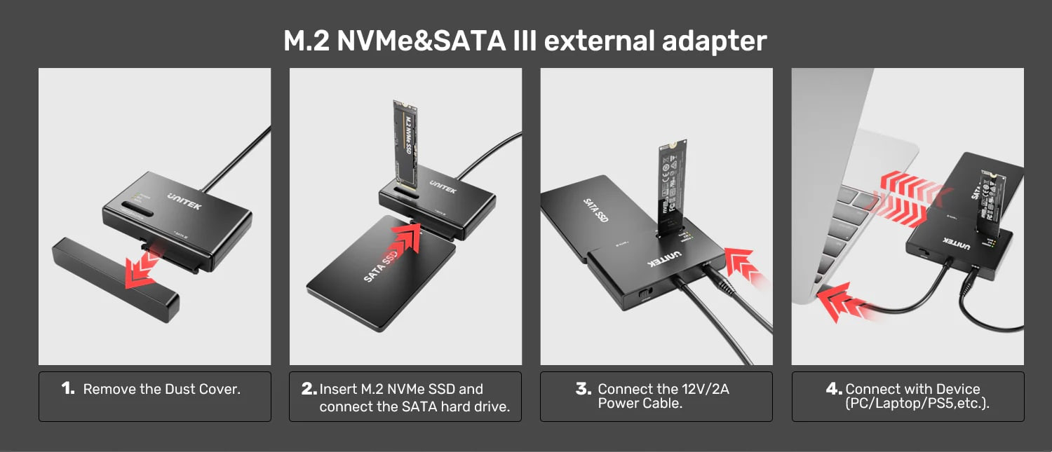 M.2 NVMe ve SATA III Harici Adaptörünü kurmak için öncelikle toz kapağını çıkarın. Ardından, M.2 NVMe SSD'yi takın ve SATA sabit sürücüyü bağlayın. Ardından, 12V/2A güç kablosunu bağlayın. Son olarak, adaptörü PC, dizüstü bilgisayar veya PS5 gibi bir cihazınıza bağlayın. Bu basit işlem, depolama ihtiyaçlarınız için hızlı ve verimli bir kurulum sağlar.