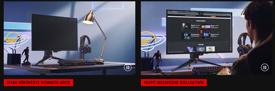 ASUS ROG Swift PG27UCDM monitör, proximity sensörü ve kişiselleştirilebilir ayarları ile kullanıcıya duyarlı bir deneyim sunar. Otomatik siyah ekrana geçiş ve tespit mesafesi ayarı sayesinde enerji verimliliği sağlanır. Akıllı fonksiyonlar, günlük kullanımda kolaylık ve konforu artırır. ASUS monitör kategorisinde akıllı özellikleriyle dikkat çeker.