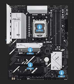 Asus B650E Max Gaming WiFi AM5 anakartta yer alan 11 fazlı dijital VRM (Voltage Regulator Module), işlemciye kararlı ve verimli güç aktarımı sağlar. Bu yapı özellikle yüksek performans gerektiren oyun ve uygulamalarda işlemcinin istikrarlı çalışmasını destekler. VRM DIGI+ teknolojisi ile güç dağılımı optimize edilir ve uzun süreli kullanımda bile ısı yönetimi sağlanır. Pasif soğutma blokları, VRM ve M.2 bileşenlerinin sıcaklığını düşük tutarak sistem ömrünü uzatır.