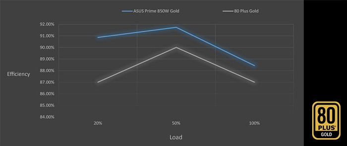 ASUS Prime 850W Gold PSU, kendisine 80 PLUS® Gold statüsü kazandıran düşük ESR’li kapasitörler ile verimli çalışma sağlar. %92’ye varan verimlilik sayesinde daha az ısı, daha az fan gürültüsü ve daha fazla güvenilirlik ortaya koyar.