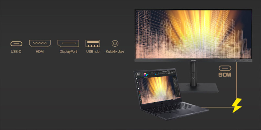 ProArt Display PA348CGV; USB-C, HDMI ve DisplayPort ile çoğu multimedya cihazıyla uyumlu çalışıyor. Entegre USB-C girişi; veri transferi, DisplayPort ve ayrıca 90W güç aktarımına destek veriyor. PA348CGV ayrıca bir USB merkezi görevi de görüyor. Monitöre USB-C üzerinden (C’den C’ye veya C’den A’ya kablosu ile) bağladığınız cihazlarınız, USB girişlerine bağlı diğer çevre birimlerine erişebiliyor.