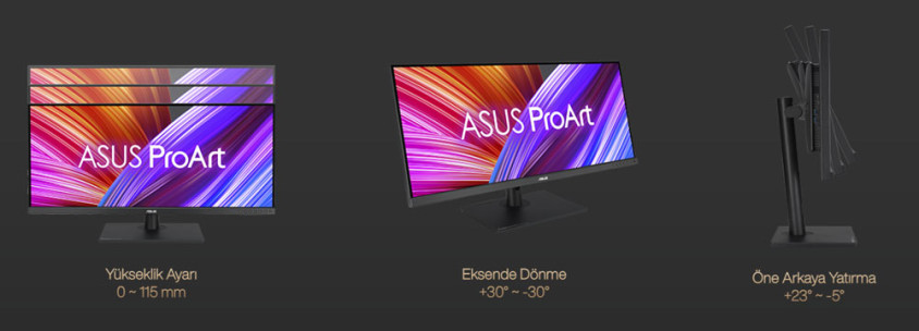 Öne arkaya eğme, eksen etrafında dönme ve yükseklik ayarına sahip ergonomik tasarımlı stant sayesinde rahat bir izleme pozisyonu her zaman elinizin altında. Bu özellikler sayesinde artırılmış üretkenlik ve konfor için müthiş izleme ayarları yapabiliyorsunuz. Kablo düzenlemeyi kolaylaştıran tasarımı ile masanızın düzenli durması için çeşitli kabloları düzenleyip saklayabiliyorsunuz. Ayrıca hızla çıkarılabilen bu stant, ekranı entegre VESA duvar montajı parçasına vida gerektirmeden saniyeler içinde kolayca takma imkanı sunuyor.Yükseklik Ayarı: 0 ~ 115 mm