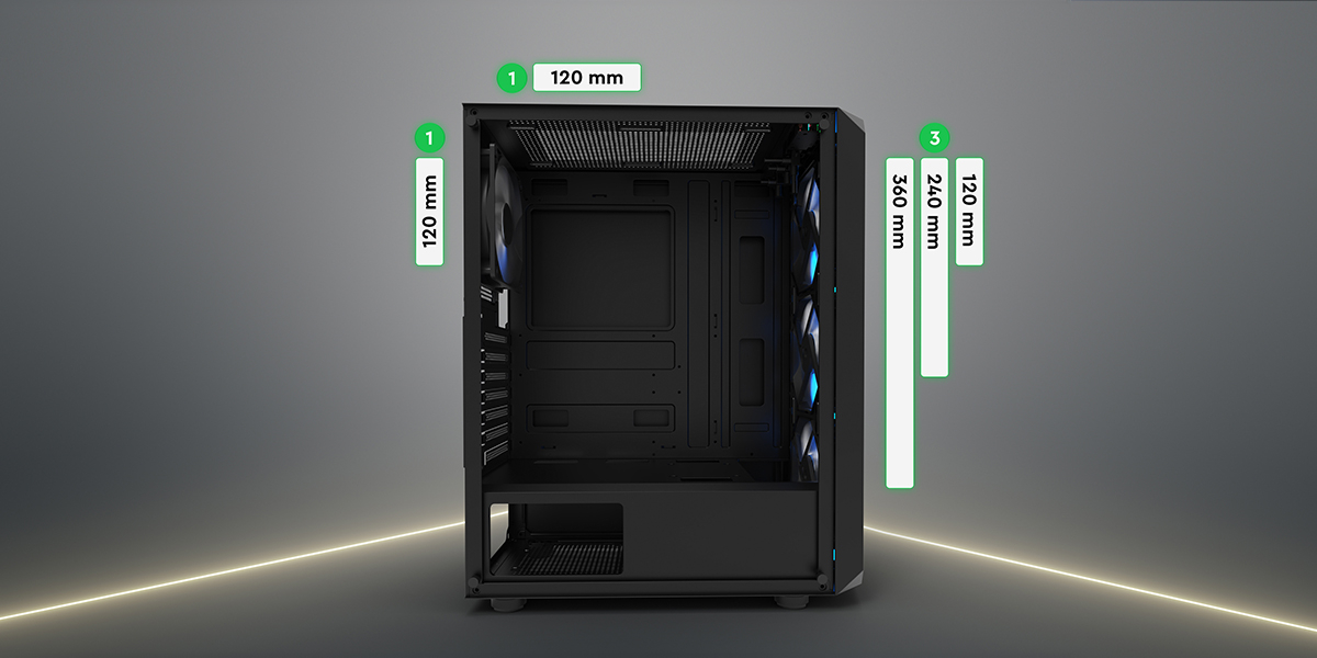 Geniş radyatör desteği ile yüksek performanslı oyunlar sırasında bile bilgisayarınızın serin kalmasına olanak sağlar..