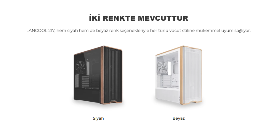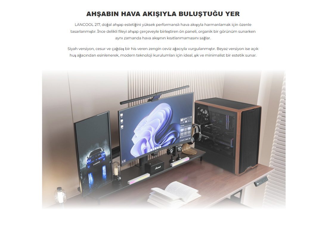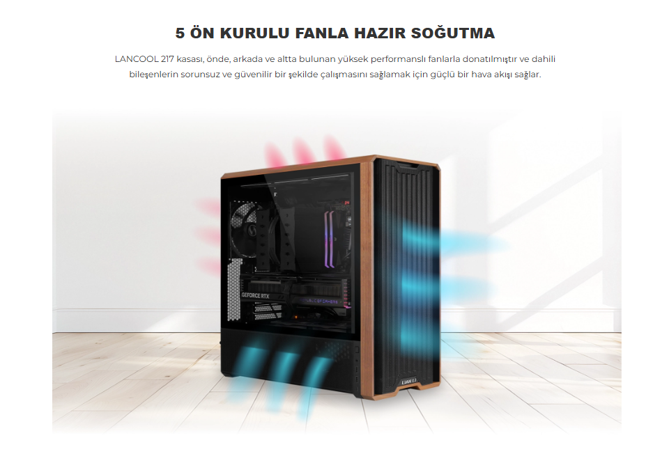 Zamansız Zarafet, Sonsuz PerformansLANCOOL 217, yenilikçi soğutma tasarımını gerçek ahşap detaylarla birleştiren bir orta boy kule kasadır. Beş fanla birlikte gelir ve kutudan çıktığı anda optimize edilmiş hava akışı sağlar. Esnek PSU montaj tasarımı, kablo yönetimini kolaylaştırır. Koyu ahşap detaylarla Siyah veya açık ahşap detaylarla Beyaz seçenekleriyle sunulan bu kasa, doğal güzelliği yüksek performansla birleştirir.