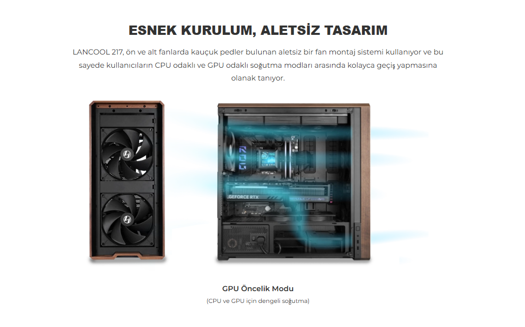 LANCOOL 217, ön ve alt fanlarda kauçuk pedler bulunan aletsiz bir fan montaj sistemi kullanıyor ve bu sayede kullanıcıların CPU odaklı ve GPU odaklı soğutma modları arasında kolayca geçiş yapmasına olanak tanıyor.