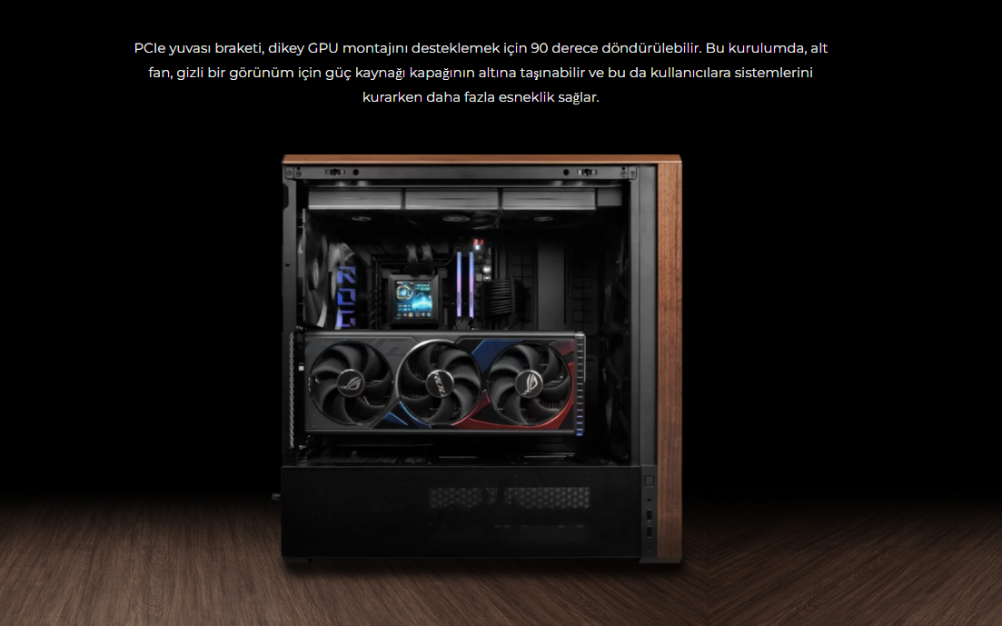 PCIe yuvası braketi, dikey GPU montajını desteklemek için 90 derece döndürülebilir. Bu kurulumda, alt fan, gizli bir görünüm için güç kaynağı kapağının altına taşınabilir ve bu da kullanıcılara sistemlerini kurarken daha fazla esneklik sağlar.