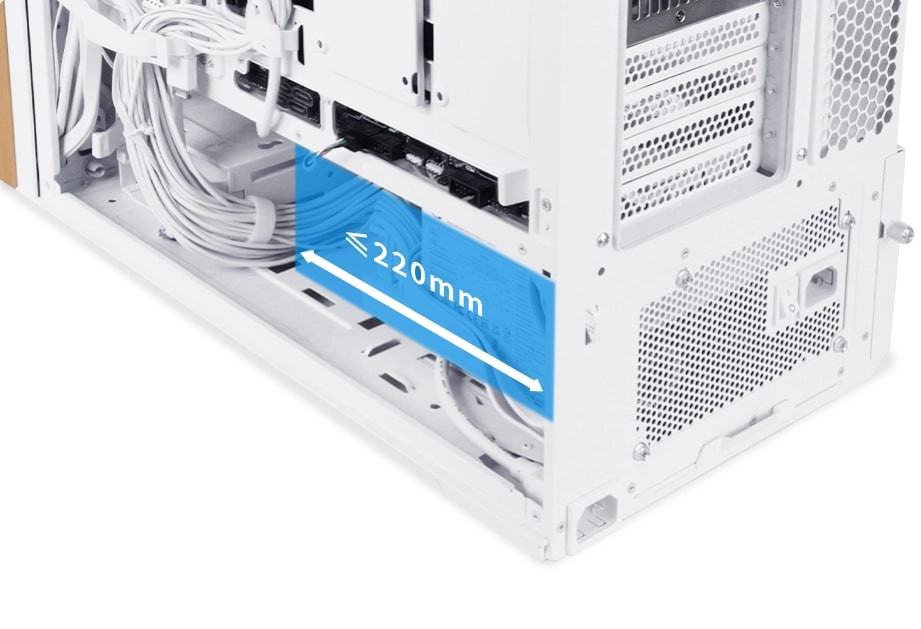 PSU, konektörler sağ tarafa bakacak şekilde 90° döndürüldüğünde, 180 mm'ye kadar kompakt PSU'ları destekler. Bu, kablo yönlendirme alanını optimize eder ve fanın PSU'yu doğrudan soğutmasını sağlayarak soğutma verimliliğini artırır. Kullanıcılar ayrıca, gizli bir görünüm için birlikte verilen iki alt fanı braketin altına taşıyarak kasayı daha temiz ve düzenli hale getirebilirler.