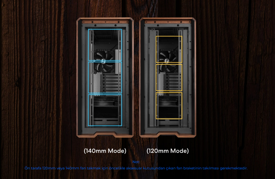 Not: Ön tarafa 120mm veya 140mm fan takmak için öncelikle aksesuar kutusundan çıkan fan braketinin takılması gerekmektedir.