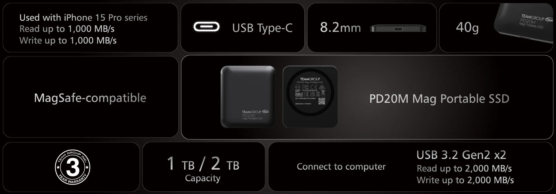 TEAMGROUP PD20M Manyetik Taşınabilir SSD, iPhone 15 Pro serisinde tanıtılan 10 Gbps aktarım hızına sahip USB Type-C arayüzüyle aynı olan bir USB Type-C arayüzü kullanır. Bu nedenle, PD20M Mag, bir iPhone 15'te depolama kapasitesini genişletmek için kullanılabilir ve depolama aygıtı kullanımı için olasılıkları yeniden tanımlar.