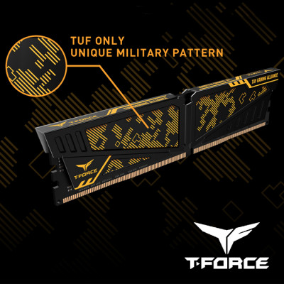 Anakart lideri Asus ile bir kez daha güçlerini birleştiren TeamGroup T-Force, hız aşırtılmış oyuncu belleği T-Force Vulcan TUF Gaming Alliance’ı sunar. TUF Gaming Alliance tarafından zorlu testlere tabii tutulmuş ve onaylanmış olan T-Force Vulcan TUF Gaming Alliance, askeri kamuflaj desenli görünümüyle eşsiz bir tasarıma sahiptir. Bu tasarımıyla, tüketicilere benzersiz tarza sahip bir donanım tecrübesi sunmasının yanı sıra T-Force Vulcan TUF Gaming Alliance bellekler, 3200MHz saat frekansları ile yüksek hızda performans deneyimi vadeder. T-Force Vulcan TUF Gaming Alliance oyun bellekleri, oyunlarınızda en zorlu savaş alanlarındayken veya hız aşırtma sınırlarını zorladığınızda kesinlikle sizin en iyi yoldaşınızdır.TUF Askeri Desen Tasarımı
