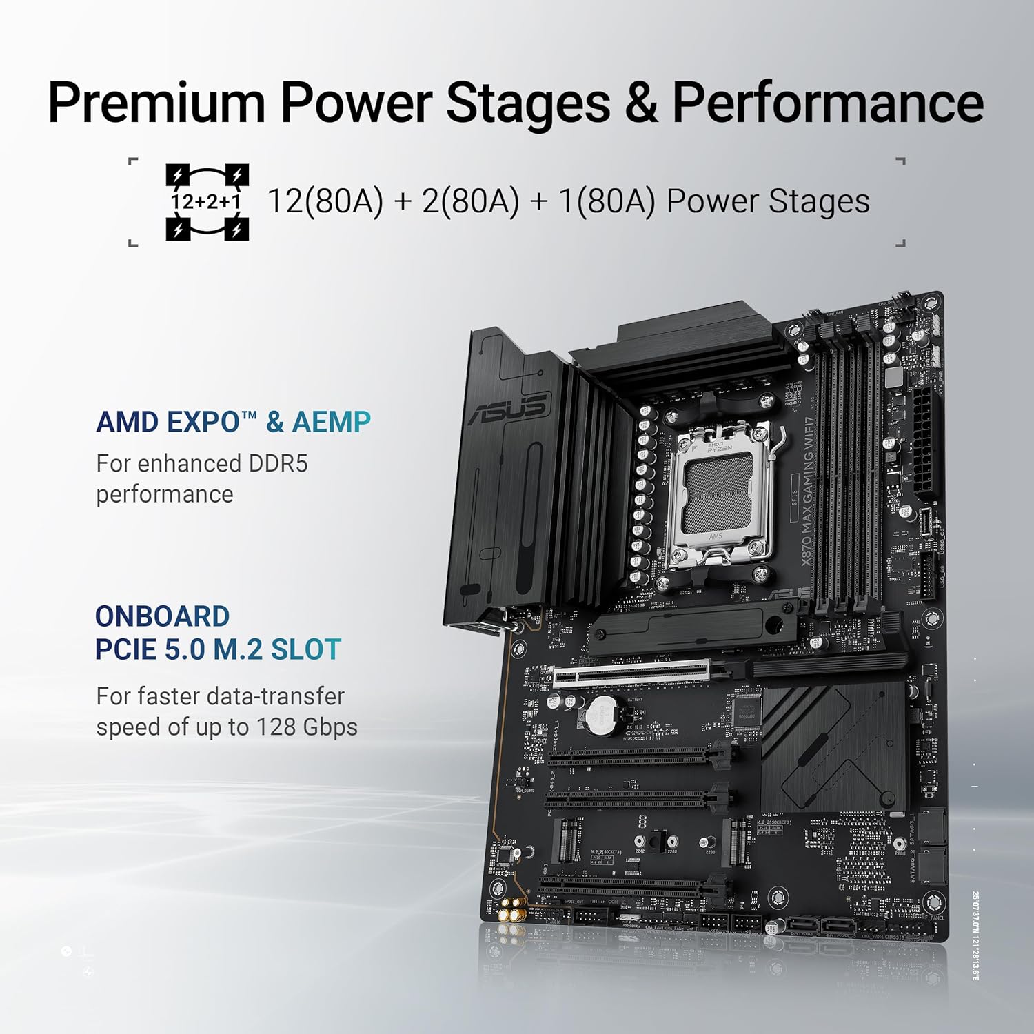 Asus X870 Max Gaming WiFi7 anakart, 12+2+1 fazlı premium güç aşamaları ile sistemdeki tüm bileşenlere istikrarlı enerji sağlar. AMD EXPO ve AEMP desteğiyle DDR5 belleklerin kapasitesi ve hızı en üst seviyeye çıkarılır. PCIe 5.0 M.2 slotu, 128 GB/s'ye varan hızlı veri transferiyle oyun ve profesyonel kullanımda büyük avantaj sunar. Gelişmiş güç yönetimi, uzun süreli ve yoğun kullanımda dahi yüksek stabilite ve güvenilirlik sağlar.